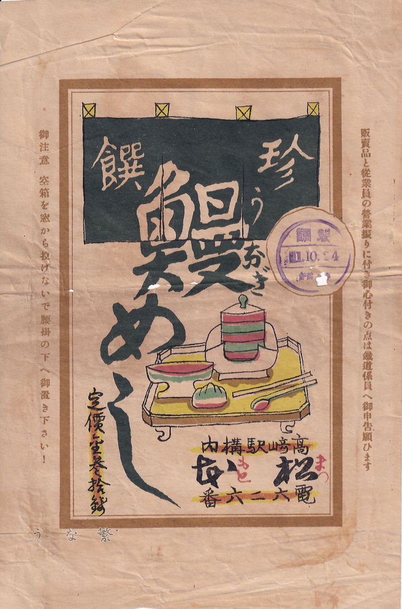 高崎駅 1月10日24時製造 30銭 この高崎駅の日付印は 上段「調製」中段「1.10.24」下段「午前〇時」 すべて左から読むような印が押されています 両脇の注意書きが活字のためおそらく昭和初期の販売だと思います 仮に中央のように毛筆手書字ならば明治 大正の可能性が高いです 基本的には日付印内は三段すべて「調製」と書いてあれば左から読み 「製調」なら右から読むようにしていますが この日付印の読む方向がまったく統一されていません 「漢字のみ」の段は右から 「数字のみ」「数字と漢字」は左から読むものもありますし 「数字と漢字」の段だけ漢数字を使い右から読ませるような印もあります また、同時期の同一商品でさえも左右違っているものもあります 「丸二印」と呼ばれる印鑑は数字の段の年月日や時間は 数字の部分を交換か回転移動して印を押しますから 印鑑は逆さ文字のため 特に日付印を導入し始めたころは 店員さんが単純に左右を間違えてしまっている事も考えられます しかし数字と違い 動かす必要がない「調製」も「製調」と混在してますから 日付印の右読み左読みは、各お弁当屋さんの判断だったのでしょう 駅弁の日付印もはがきの消印に使われる印と同じだと思いますが 郵政博物館のHPでは明治43年にはローラー式の 数字を回転移動できるタイプが長野で使用が始まったそうなので できることなら昔に戻って各お駅弁屋さんの日付印を見てみたいです 戦争以前の横書きは右から読みますが 実際は横書きではなく、縦書きを1文字づつ書いただけなので 図1を普通に読めば 縦書きですので「高崎駅たて書」と読めます 図1 図2![]() 枠を外した図2では縦書きが横書きに見えてしまう というような内容を 「NHKのチコちゃんに叱られる」で説明していたような・・・ |